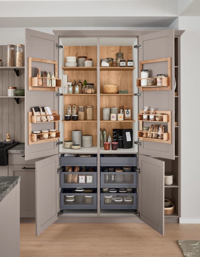 Les colonnes de rangement permettent d’optimiser la hauteur sous plafond. Les tiroirs profonds accueillent les ustensiles encombrants. Les systèmes coulissants facilitent l’accès au moindre recoin. L’objectif est clair. Rien ne doit encombrer les plans de travail. L’esthétique cottage reste intacte parce que tout trouve naturellement sa place.