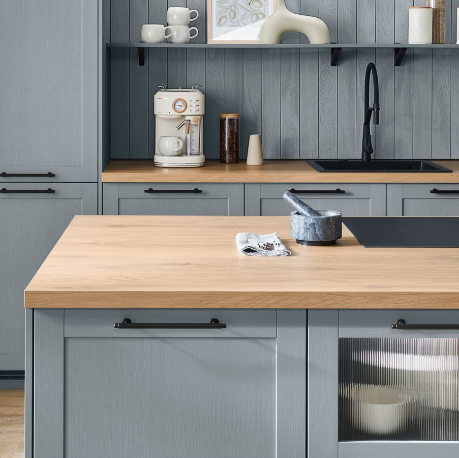 Les façades à cadre signent le style cottage, tout en finesse. Associées à des teintes douces, elles créent une ambiance chaleureuse sans alourdir l’espace.