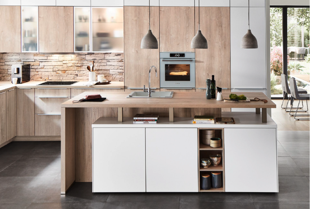 Vous pouvez ainsi réaliser cette association de couleur sur vos différents plans de travails et îlots centraux. Il est également possible d’exécuter ce mélange sur vos façades de portes de cuisine (une colonne de façades de placards blanches puis une colonne de façades bois).
