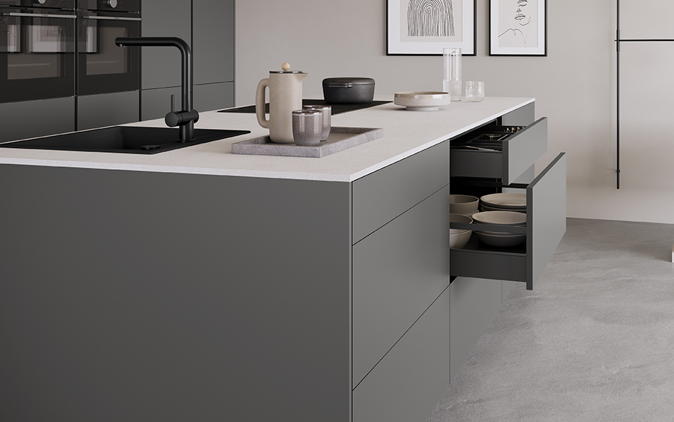 Dans une cuisine, chaque élément compte. Les tiroirs coulissants sans poignée ont été conçu pour s’intégrer parfaitement aux Cuisines Campillo, avec un profil ultra-fin de 10,7 mm et un coloris gris ardoise élégant et intemporel.