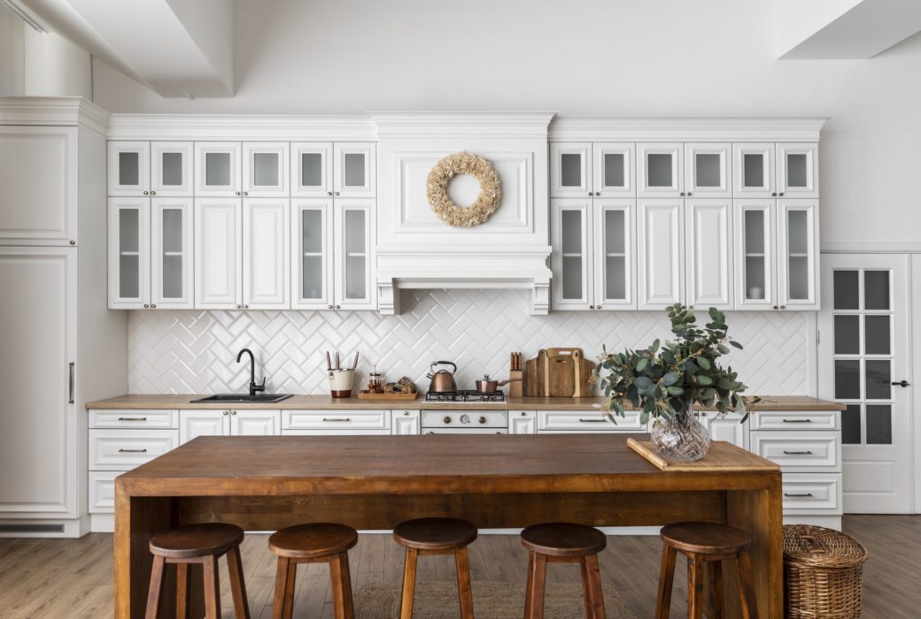Dans votre grande cuisine, optez pour un agencement uniquement fait de meubles bas d’un côté laissant une perspective intéressante en hauteur. Ajoutez des meubles hauts avec des portes monoblocs pour donner une impression longiligne et structurer votre pièce. Il ne reste plus qu’à choisir quels éléments et décors installer pour vous offrir la cuisine de vos rêves.
